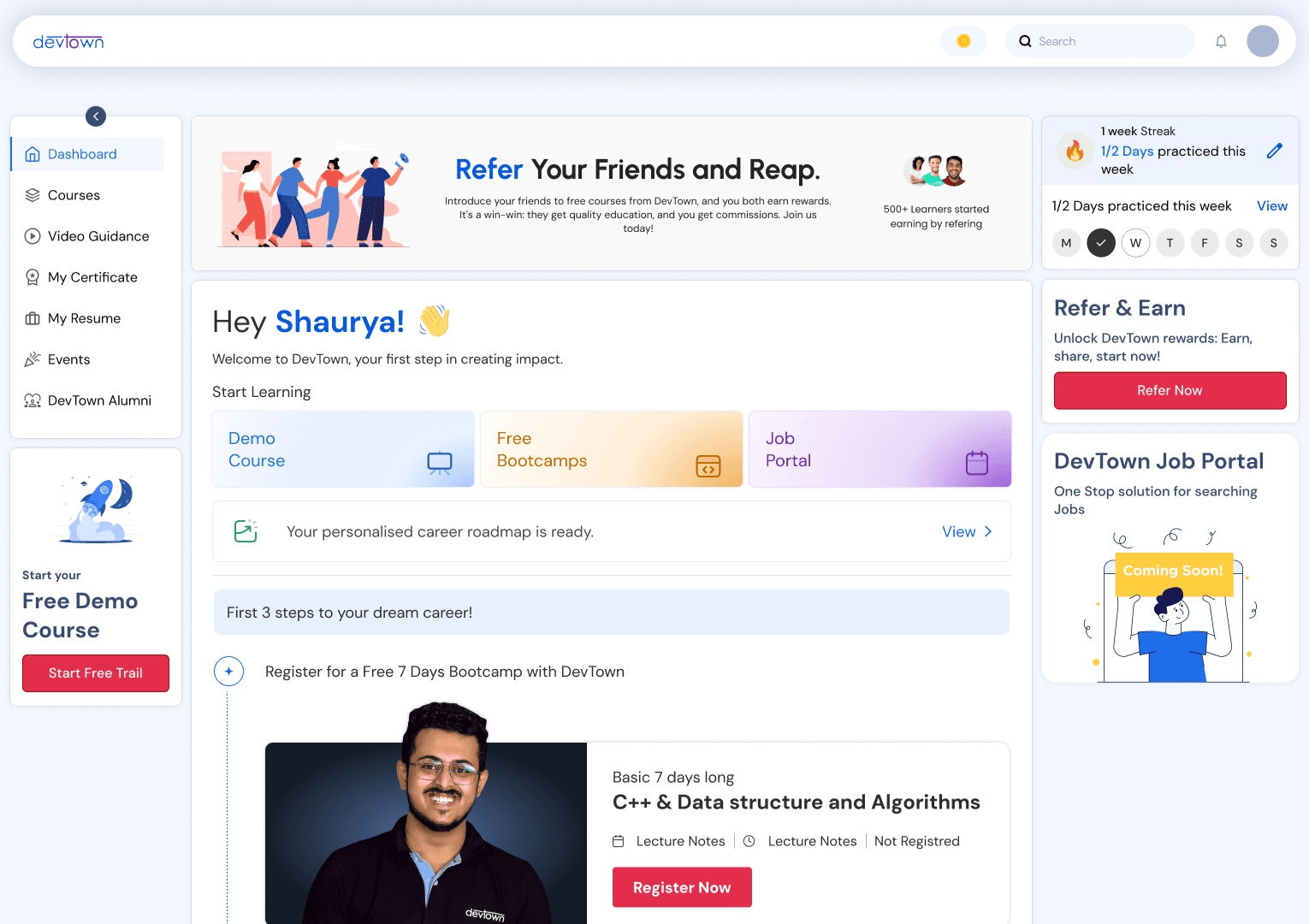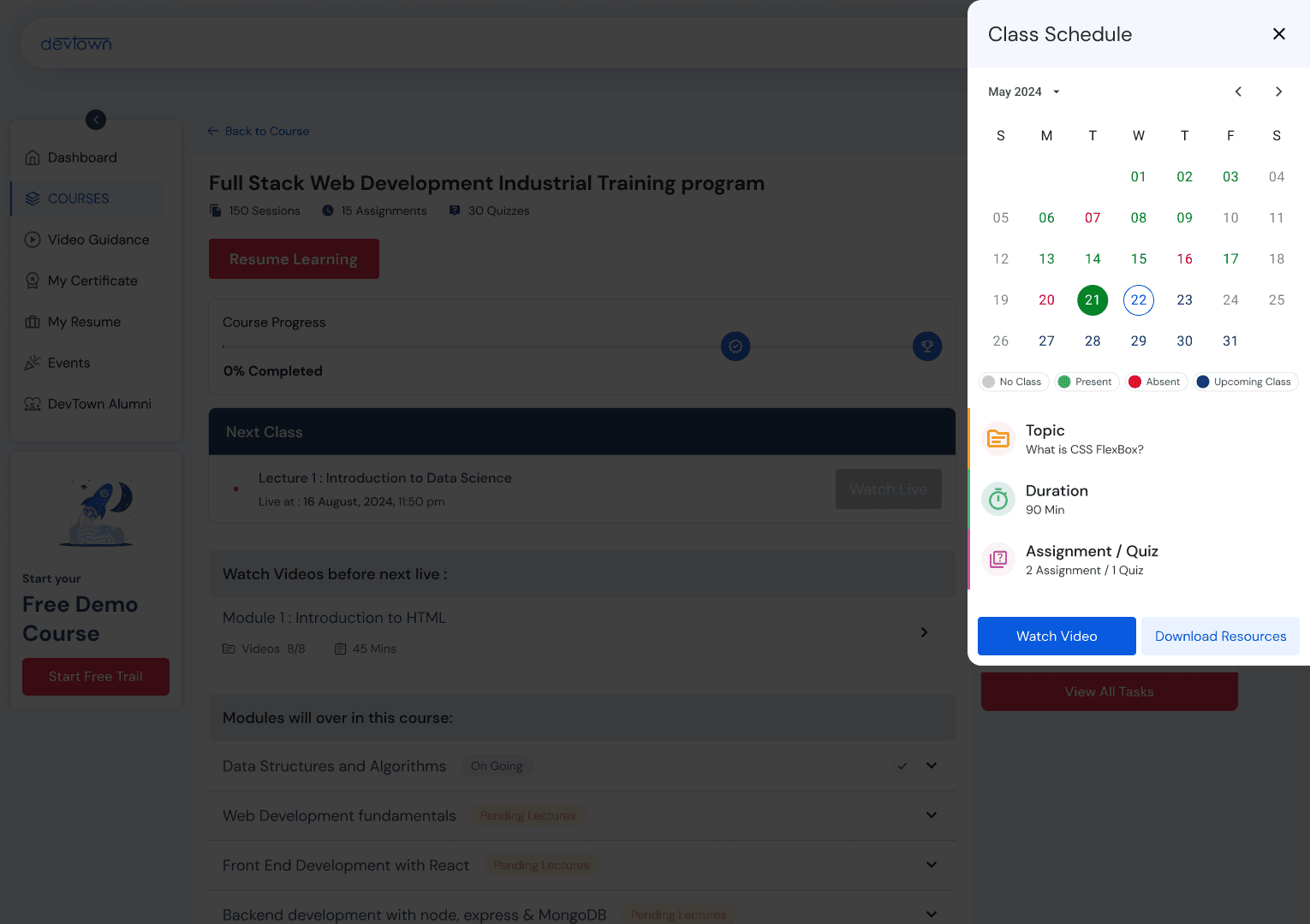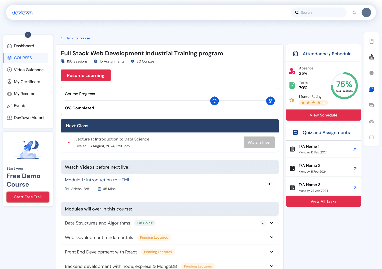 The Learning and Management System (LMS) for DevTown was developed to cater to the needs of both paid and non-paid users, focusing on providing an efficient, modern, and user-friendly platform. DevTown is an education and research-based company offering online tech courses and free bootcamps. The LMS was designed to improve user engagement, streamline workflows, and provide better support for both students and administrators.