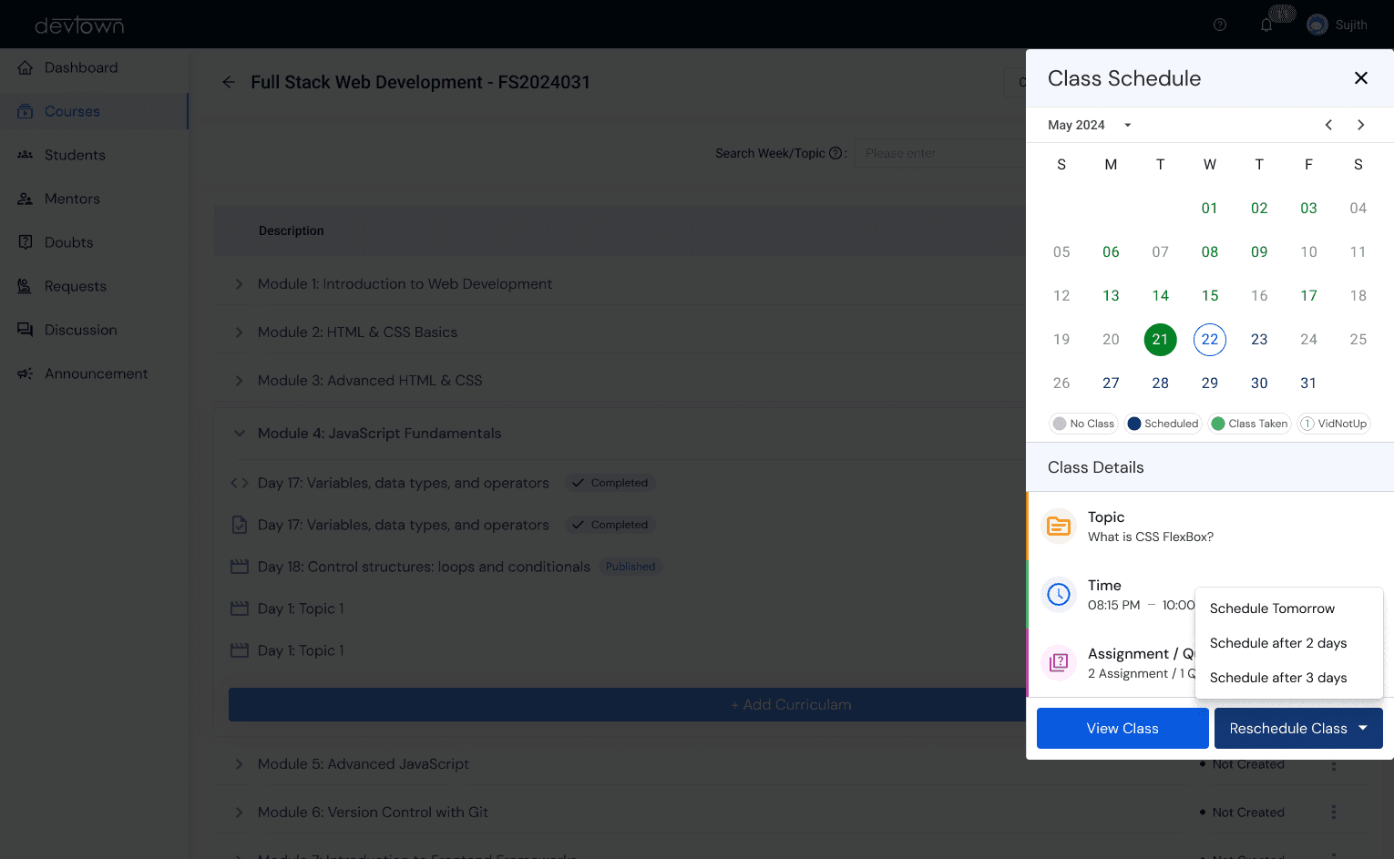 Course & Class Management Tools for creating and managing courses, scheduling classes, and assigning tasks like assignments, quizzes, and coding exercises. Comprehensive Mentor Tools