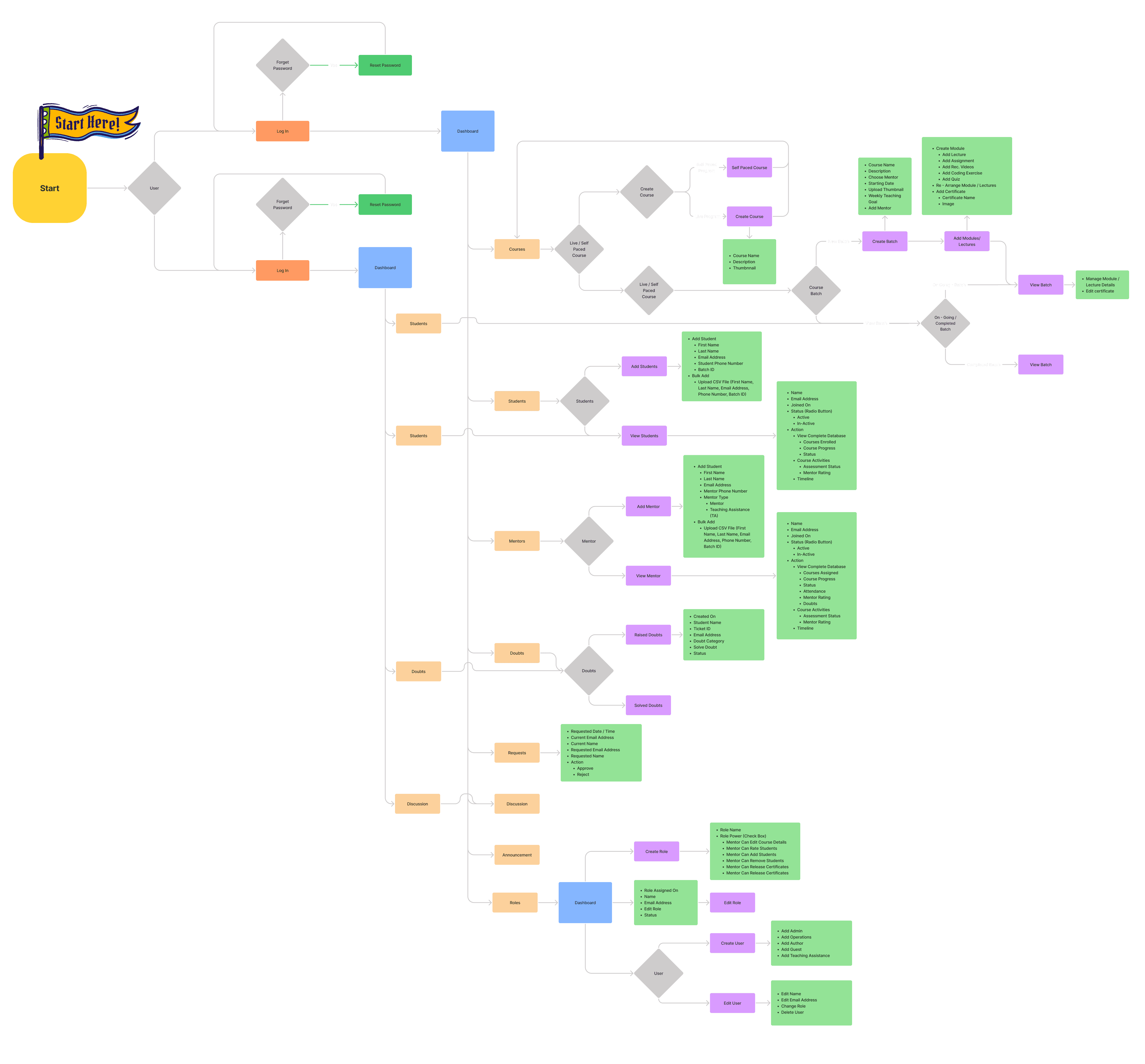 Low-fidelity wireframes for key features, such as the student dashboard and admin panel. Brainstormed with stakeholders on necessary features like live chat, community forums, and scheduling tools.
